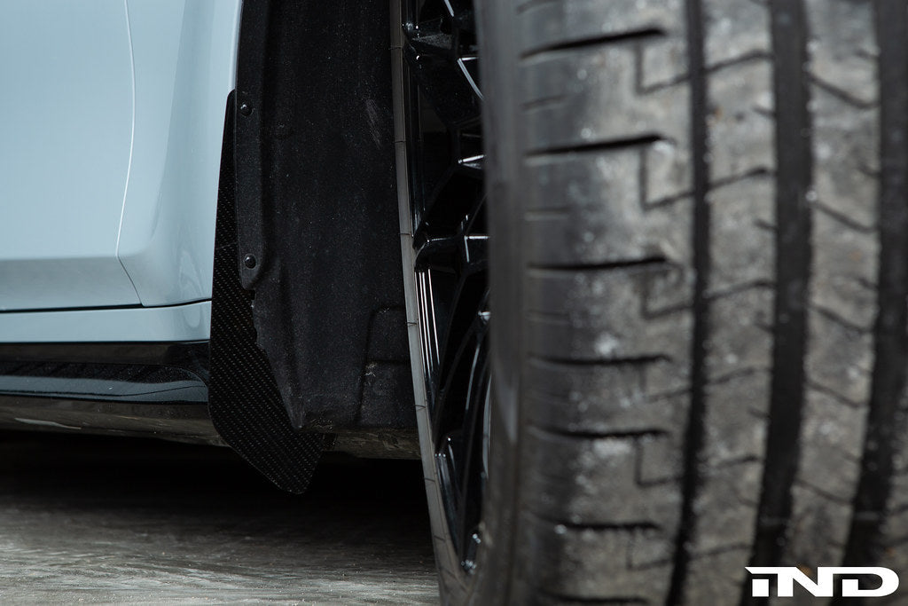 G82/G83 M4とAutoTecknicは、小さな飛び石によるダメージを防ぐだけでなく、路面の水たまりや舗装したばかりのタールからも保護できるよう、カーボンファイバー製のスプラッシュガードを特別に設計しました。AutoTecknicのカーボンファイバー製スプラッシュガードは、純正の取り付け位置を利用し、熟練の職人が3Kツイル織りカーボンファイバーを用いて熟練の職人技で作り上げることで、完璧な美観とフィット感を実現しています。