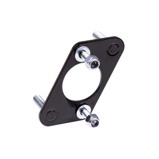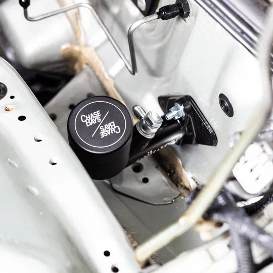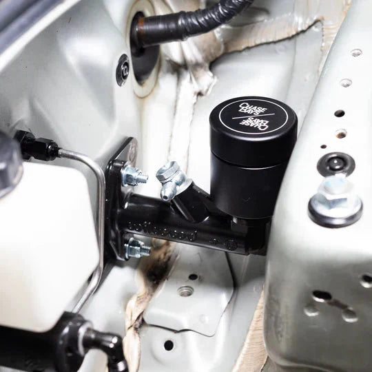 マツダの純正品と同様に、独自のビレット チェイス ベイ リザーバーまたはクラッチ フィード アダプター ホースを使用してブレーキ リザーバーと流体を共有することができます。黒色の粉体塗装プレートは 0.125 インチ (1/8 または 3.17 mm) スチール製で、マスター シリンダー取り付けスタッドが圧入され溶接されています。