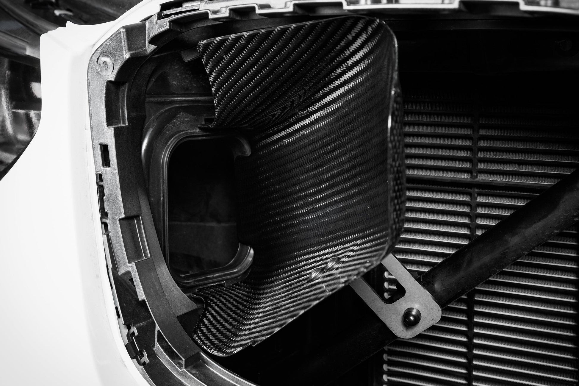 BMWのX3M / X4M インテークセットアップは、限られたスペースで非常によく設計されたシステムです。フィルターからターボ吸気口までの流路は非常に直線的で、通常の純正エアボックス設計のように急激に方向を変えることはありません。そのため、完全な再設計ではなく、純正エアボックスを改良して流れの制限を少なくし、温度効率を向上させることに焦点を当てました。当社では、純正の紙製フィルターに比べて流量がはるかに高い不織布メッシュ製の交換用ドロップインフィルターを開発しました。入口の空気温度を下げ、エアボックスに空気を送り込むために、グリルの後ろに大きなフロントスクープを設計しました。カーボンスクープはダクトに空気を導き、エアボックスの入口側の制限を効果的に解消します。最後に、カーボン製エアボックスリッドをご紹介します。これは性能向上に寄与するものではありませんが、吸気音を、より聞こえやすく、大きくし、エンジンルームの美観向上に貢献します。