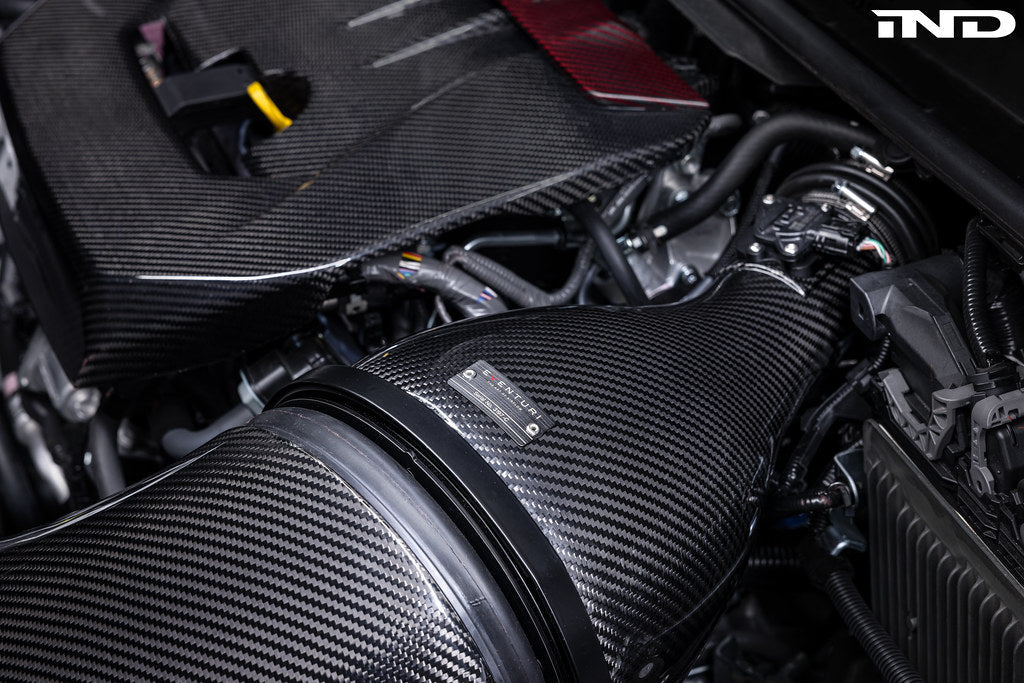 GRカローラEventuriシステムは、特許取得済みのカーボンファイバーハウジングを採用しており、フィルターからターボへの空気力学的に効率的なエアフロー経路を提供します。これは、単なるヒートシールド付きのコーンフィルターではなく、ベンチュリ効果を引き出し、層流状態を維持することでターボの抵抗を低減する独自の設計です。ハウジングの設計と仕組みについて詳しくは、こちらをご覧ください。