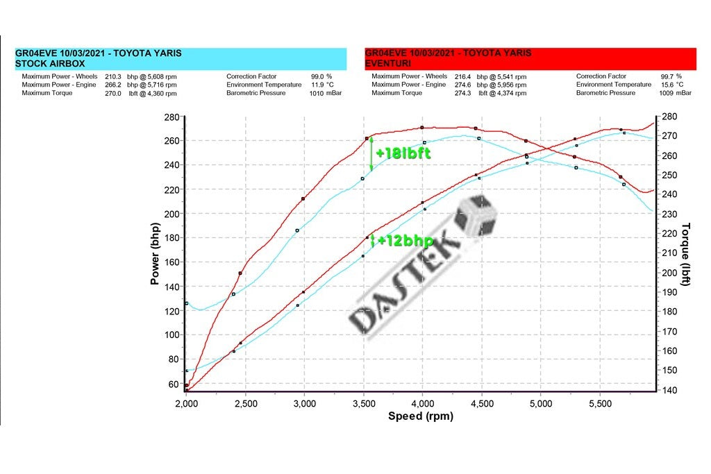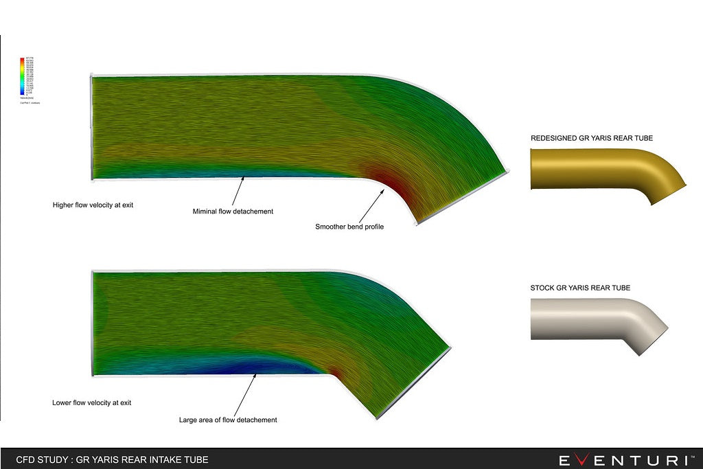 GRヤリスのEventuriシステムは、特許取得済みのカーボンファイバーハウジングを採用し、フィルターからターボへの空気力学的に効率的なエアフロー経路を提供します。これは単なるヒートシールド付きのコーンフィルターではなく、ベンチュリー効果を引き出し、層流状態を維持することでターボの抵抗を低減する独自の設計です。ハウジングの設計とその仕組みについては、 こちらをご覧ください。