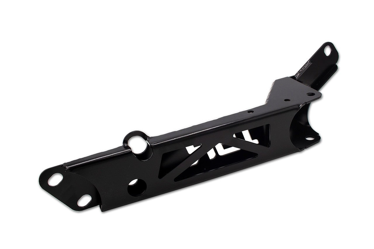 ISR Performance製 フロントテンションロッド パワーブレースは純正ベースではなく、新規に製作された交換型ブレースです。テンションロッドの取り付け部は強化され、たわみを軽減すると同時に、メインフレーム間の補強ブレースとしても機能するように設計されています。ブラケットは左右それぞれ箱型に作られており(純正はコの字型)、左右を結ぶバーは、ほとんどの社外スタビライザーに干渉しないよう作られていますが、取り外すことも可能です。マットブラックコーティング。