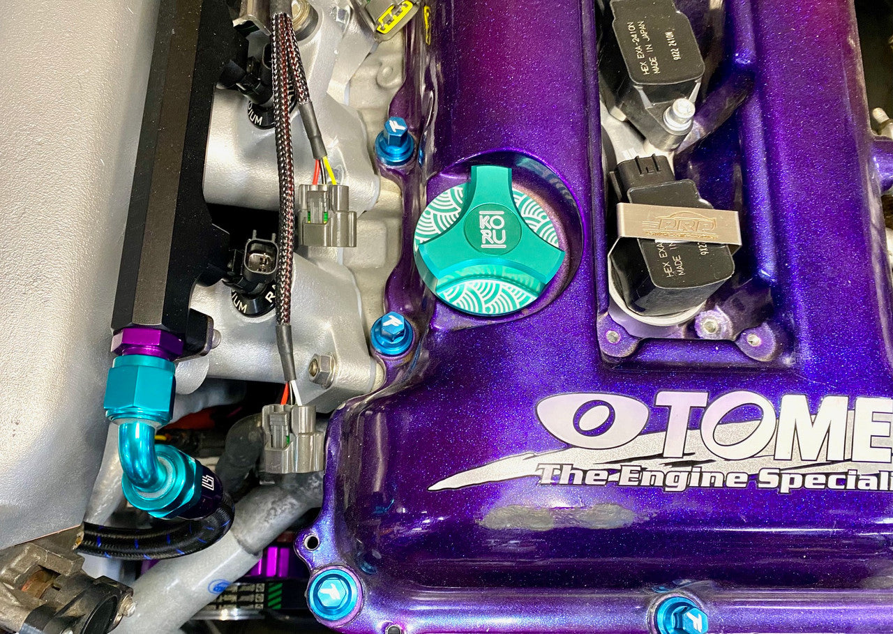 どんなに綺麗にしたエンジンルームでも、エンジン上部に居座るスタイリッシュとは言えない純正オイルキャップをわずか数秒でオシャレにできます。