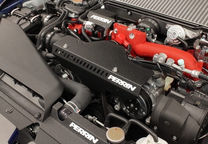 PERRINパフォーマンスのプーリーカバーは5052アルミニウム素材で作られており、ボルトオン取り付けができるよう精密に開けられた取り付け穴とPerrinロゴが刻印されています。