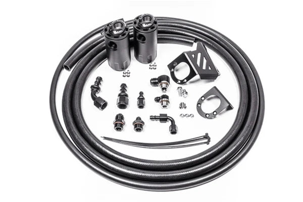 2005~2023年トヨタ タコマ用のデュアルキャッチタンクキット。オイルキャッチタンクは、クランクケースベントラインと PCV ラインの両方に接続されています。キャッチタンクは、吸気システムに溜まってエンジンの性能を低下させるオイルを集めます。すべての部品が含まれているため、簡単にボルトインで取り付けることができます。