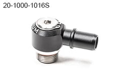90度回転アダプターフィッティング。ステンレス鋼とアルミニウム構造。 8AN ORB メスポートにねじ込み、16mm SAE クイックコネクトオスフィッティングを備えています。