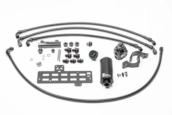 ポートインジェクションキットをラジウム製 インタンク燃料サージタンクシステムに接続するための配管キット。燃料フィルター(マイクロガラスフィルター)、プレッシャーレギュレーター、フィッティング、ブラケット、既製の燃料ラインが含まれます。