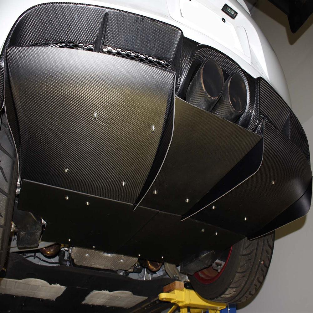 リアディフューザーは、適切に設計すれば非常に効率的なダウンフォース発生装置となります。私たちは、最先端の研究開発プロセスを用いて、ポルシェ 981 GT4にふさわしい機能的なリアディフューザーを製作することを目指しました。カーボンファイバー、シートメタル、硬質ゴムを用いることで、機能性とフォルムを融合させた構造となっています。